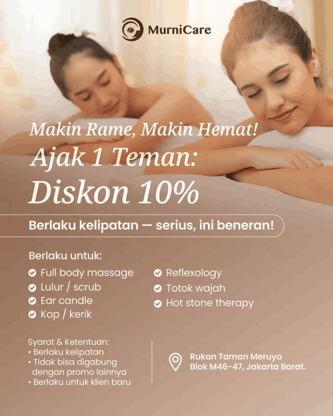 Kalau kamu belum pernah coba, ini saat yang pas buat cobain sendiri. Tapi kalau kamu sudah pernah datang sebelumnya, kamu tetap bisa menikmati promonya; tinggal ajak teman, sahabat, atau siapa pun yang belum pernah ke MurniCare Wellness aja.